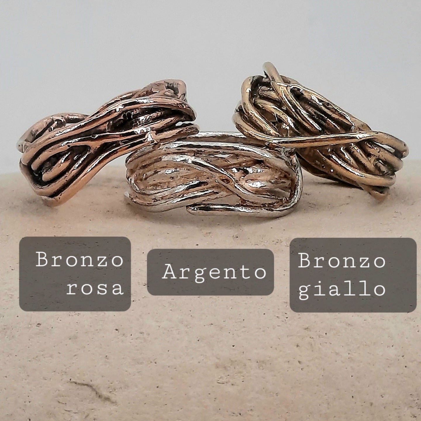 Questo anello è nato dall'incontro tra forma e spontaneità, un intreccio irregolare creato a mano, con la tecnica della cera persa, che conferisce un carattere unico a ogni dettaglio.