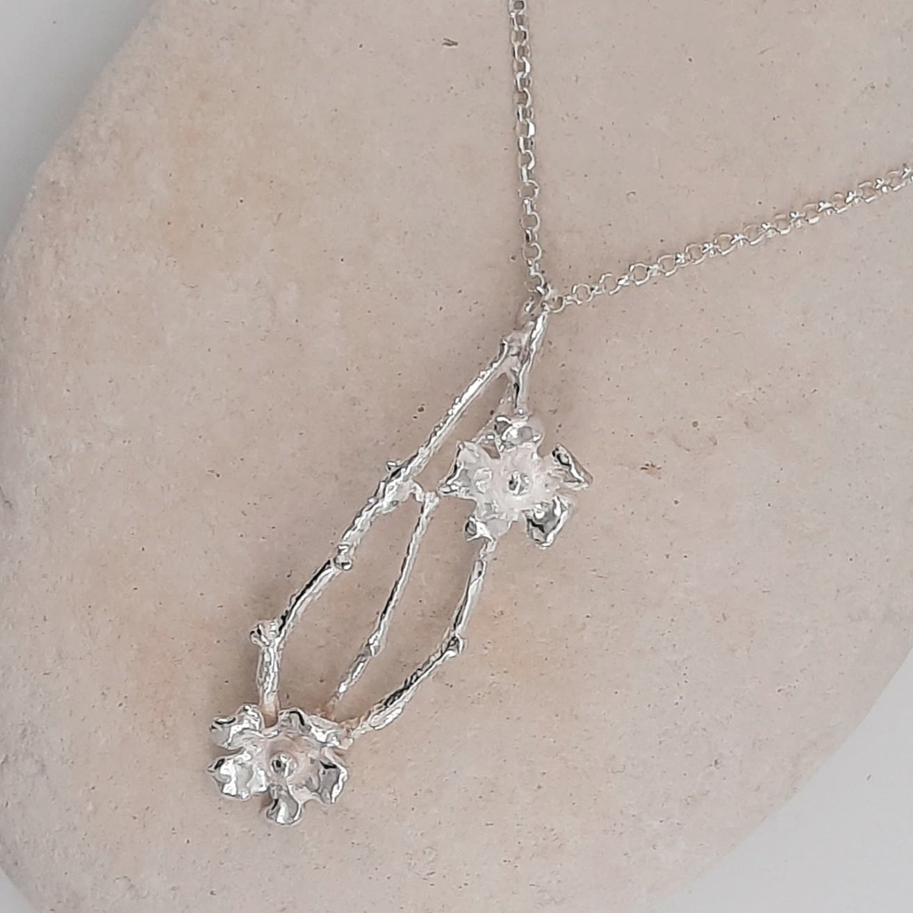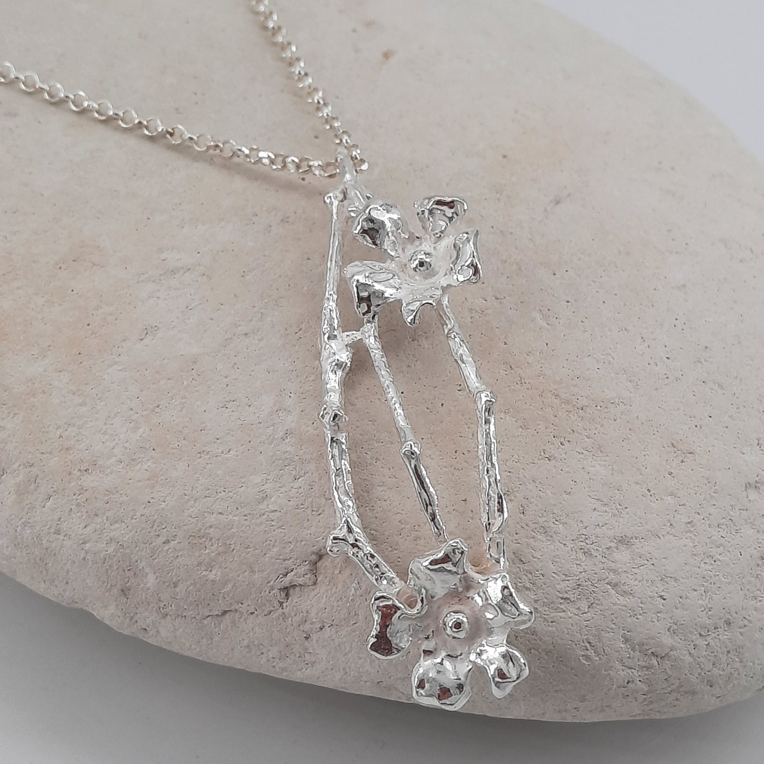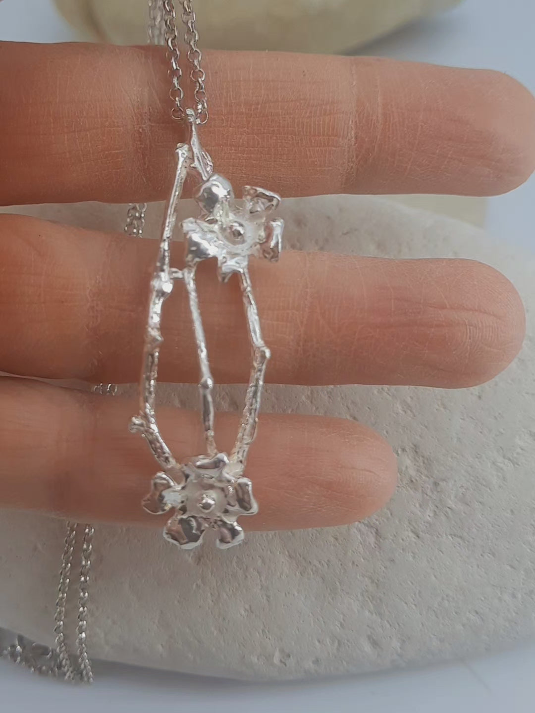 L'ho realizzato a mano con la tecnica della microfusione a cera persa in argento 925/1000, utilizzando per il calco dei piccoli rami veri, di cui il ciondolo conserva la forma e la texture, mentre i fiorellini li ho modellati a mano in cera.