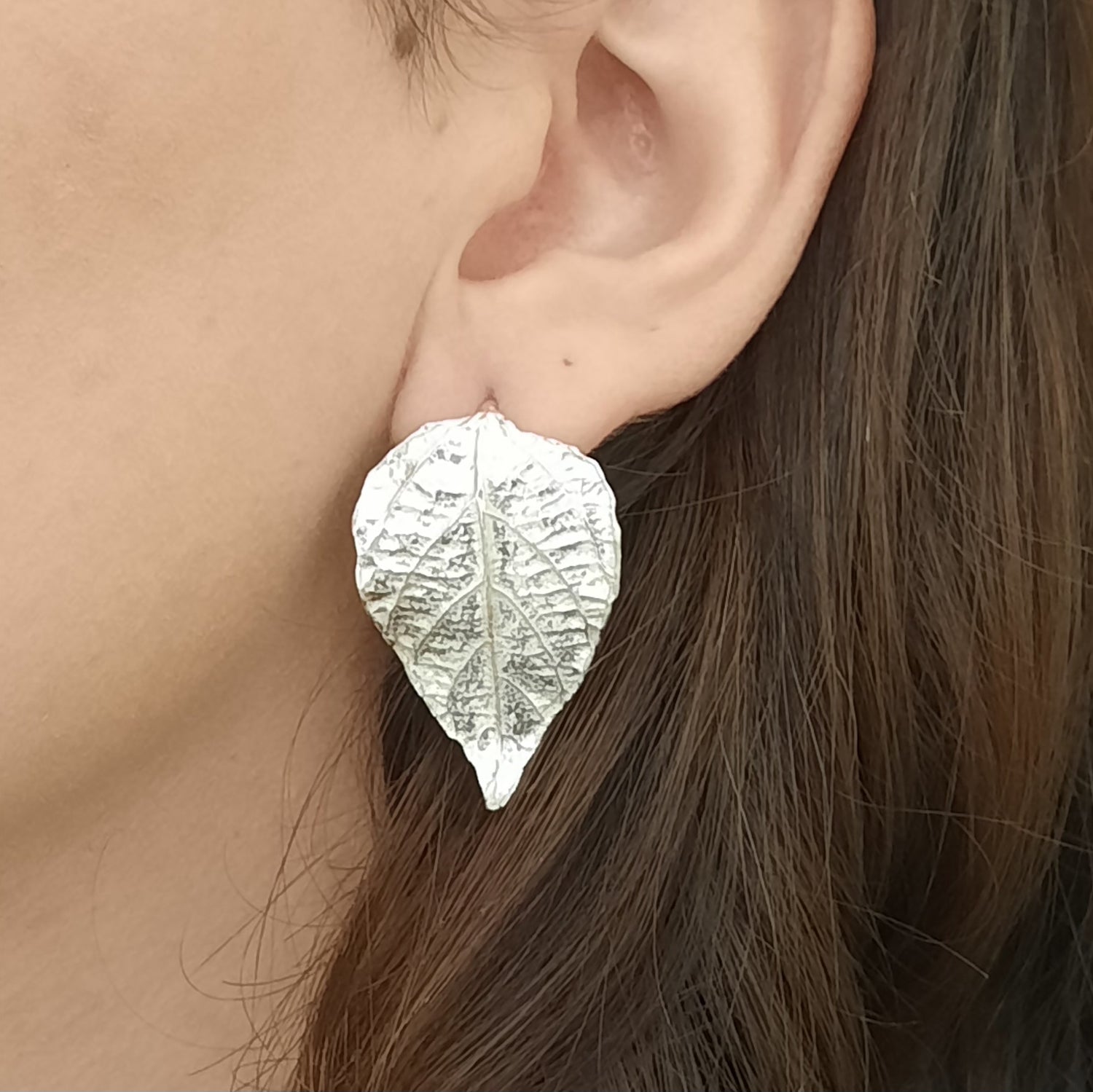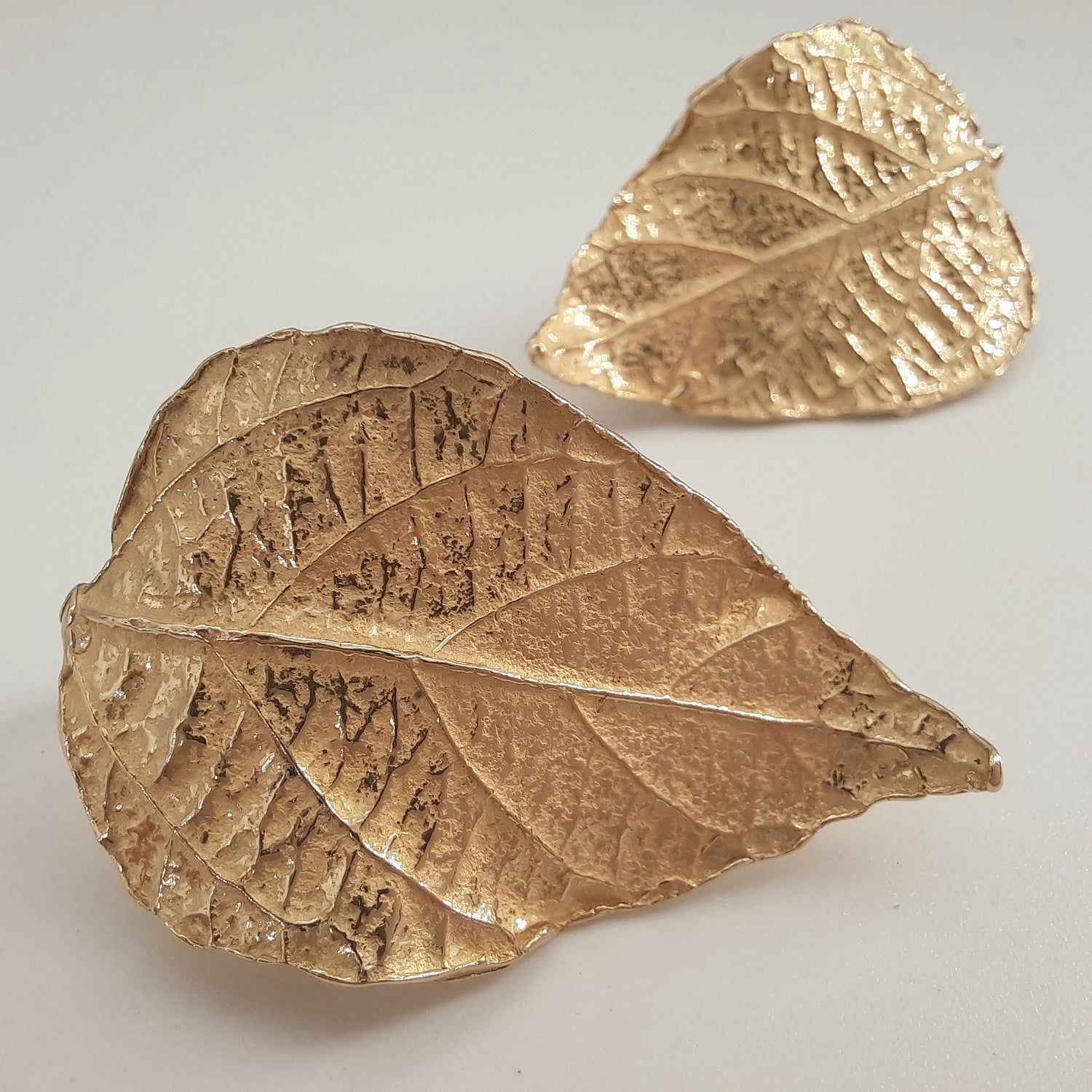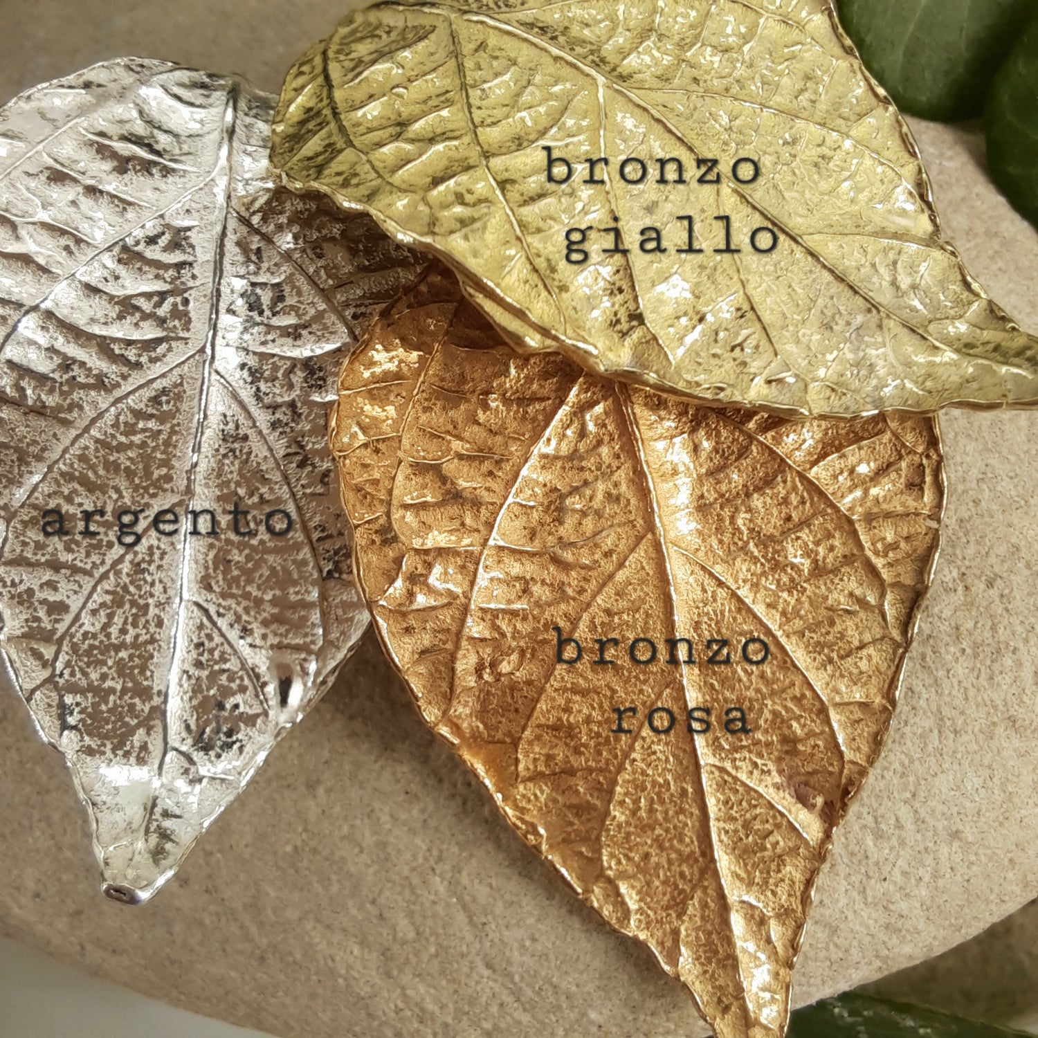 Orecchini pendenti realizzati artigianalmente a cera persa con pendente a forma di foglia. La superficie riproduce fedelmente le venature di una foglia di lantana per un effetto decorativo delicato e sorprendente.