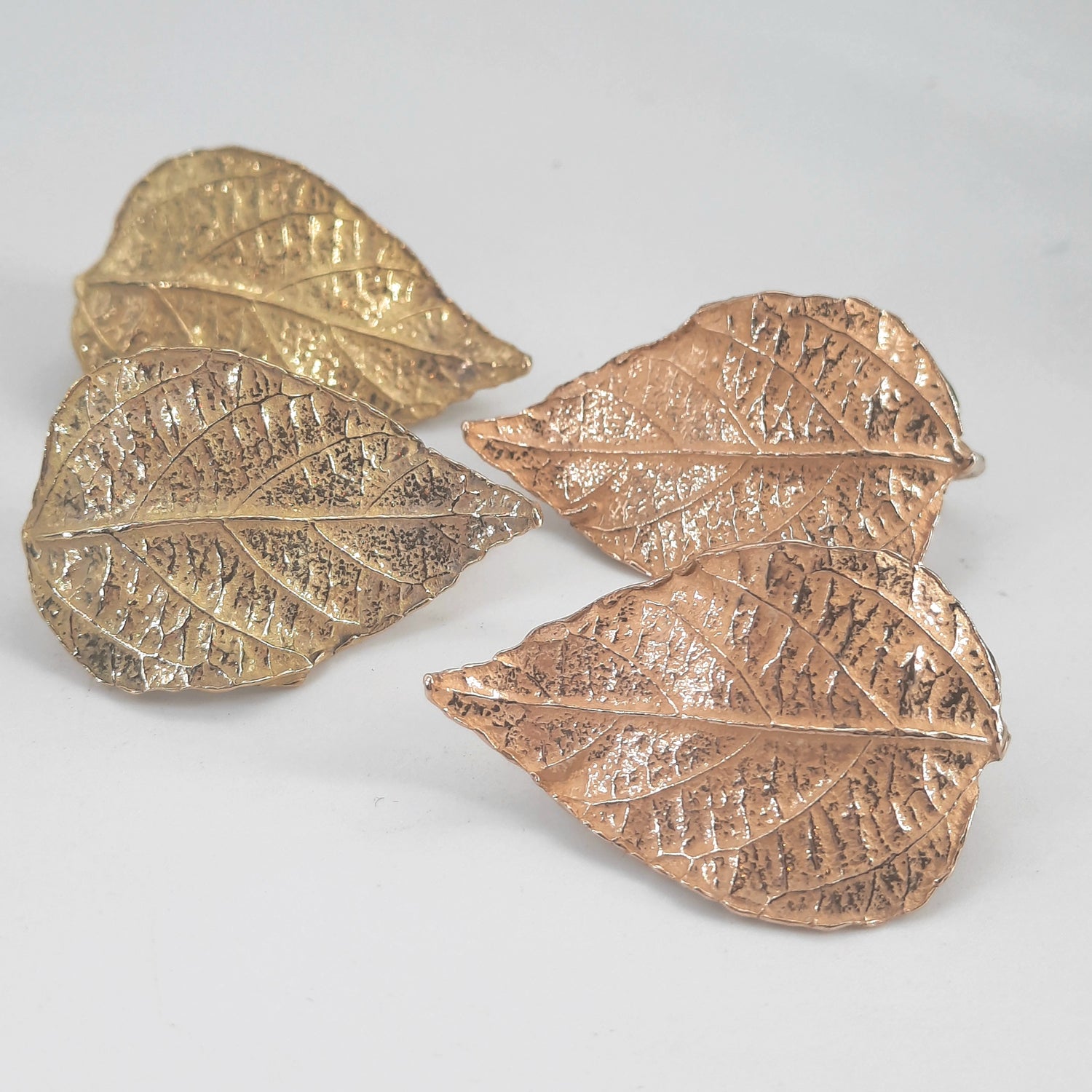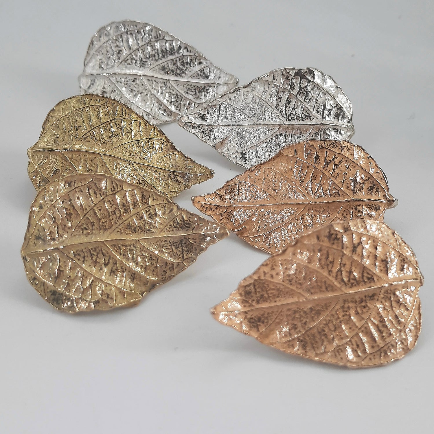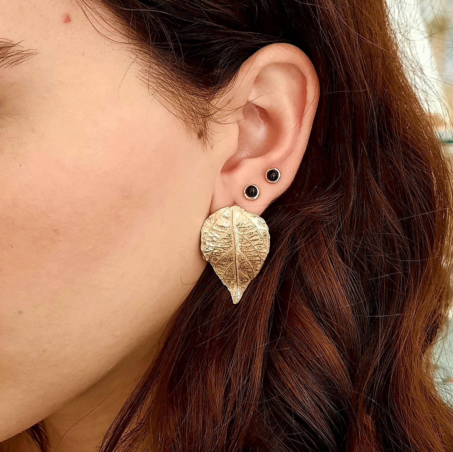 Orecchini pendenti realizzati artigianalmente a cera persa con pendente a forma di foglia. La superficie riproduce fedelmente le venature di una foglia di lantana per un effetto decorativo delicato e sorprendente.